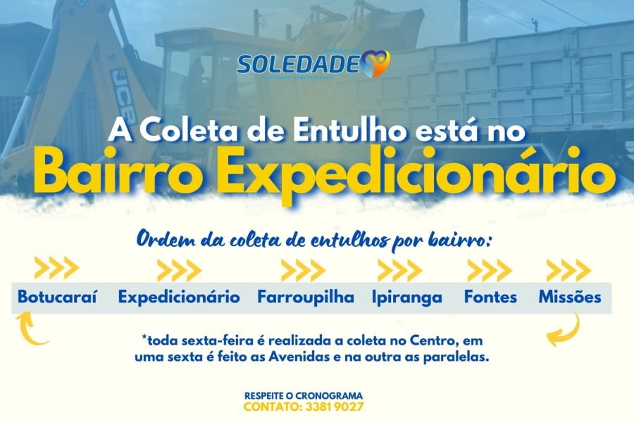 O cronograma de coleta de entulhos em Soledade já está sendo realizado no bairro Expedicionário. O serviço será realizado pela empresa responsável por cerca de 15 dias. Os moradores podem colocar os materiais em frente a sua residência, em local de fácil acesso. O material retirado das vias públicas está sendo enviado para a correta destinação por empresa terceirizada.
