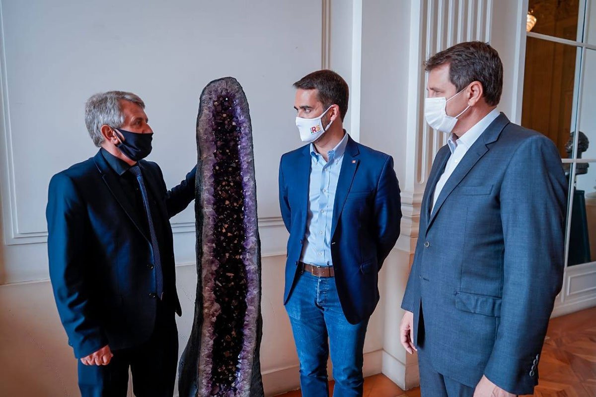 Na oportunidade, o governador Eduardo Leite também foi presenteado com uma luminária de ágata. “Estamos trabalhando para, cada vez mais, colocar em evidência o setor pedrista, valorizando as empresas do ramo. Já temos peças em locais estratégicos, como na Assembleia Legislativa, na Fiergs e na Casa do Governo do Estado no Parque Assis Brasil, em Esteio, onde acontece a Expointer”, assinala Gilberto Bortoluzzi, presidente do Sindipedras.