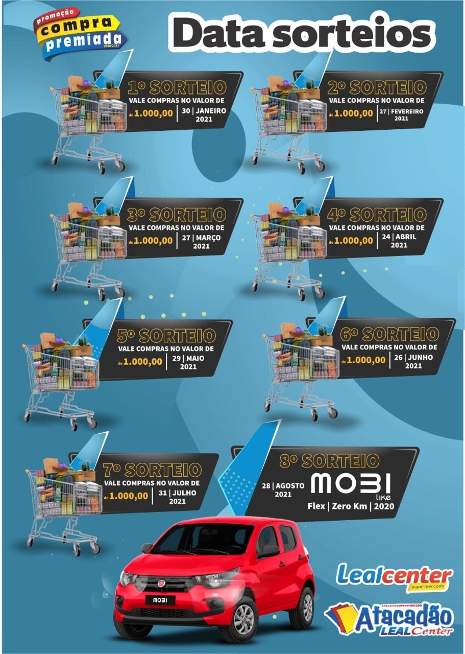 O próximo sorteio acontece no dia 29 de maio, no Atacadão. Ao todo, a promoção vai premiar os clientes com sete super ranchos no valor de R$ 1 mil cada. O grande sorteio final será realizado no dia 28 de agosto de 2021, quando a Rede Leal Center vai entregar um automóvel Mobi Like Flex 2020 0Km.