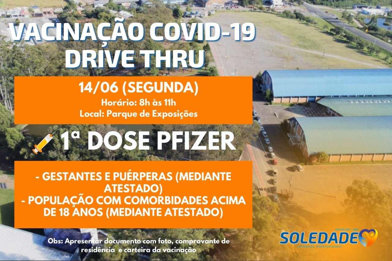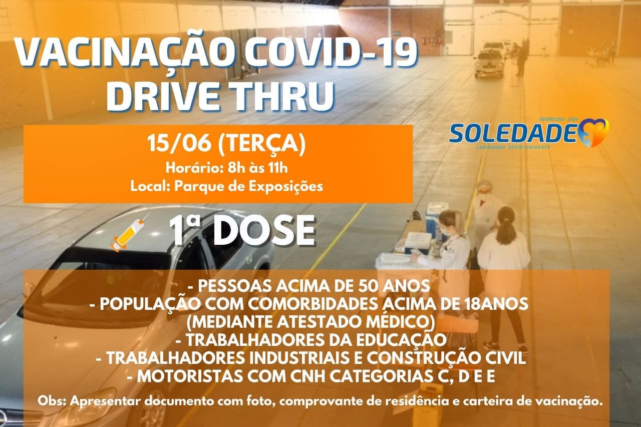 Na terça-feira, 15/06, o drive-thru acontece das 8h às 11h, para aplicação da primeira dose para a população acima de 50 anos, pessoas com comorbidades acima de 18 anos, trabalhadores da educação, industriais e construção civil e motoristas com CNH categorias C, D e E.