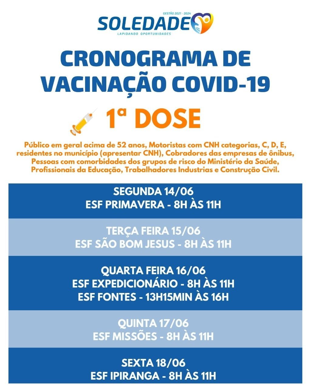 A Secretaria de Saúde de Soledade divulgou a programação desta semana para vacinar a população contra a Covid-19 no município.