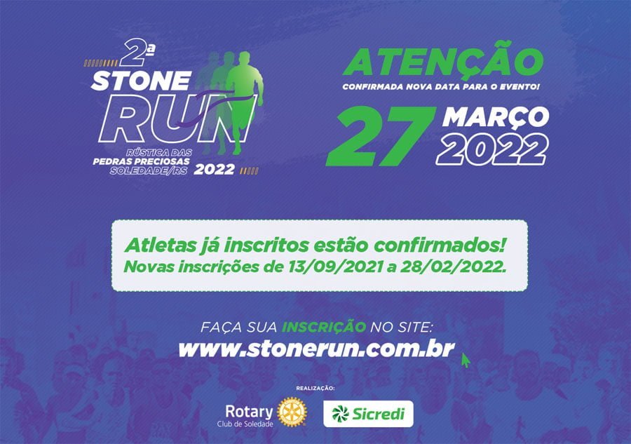 Os organizadores da rústica das pedras preciosas, denominada Stone Run vem à público comunicar aos atletas, pessoas inscritas e demais interessados, da transferência do evento para a data de 27 de março de 2022, em Soledade, tendo como local o Largo da Matriz, Praça Olmiro Ferreira Porto. A transferência atende mais uma vez às normas sanitárias em função da situação da Covid-19.