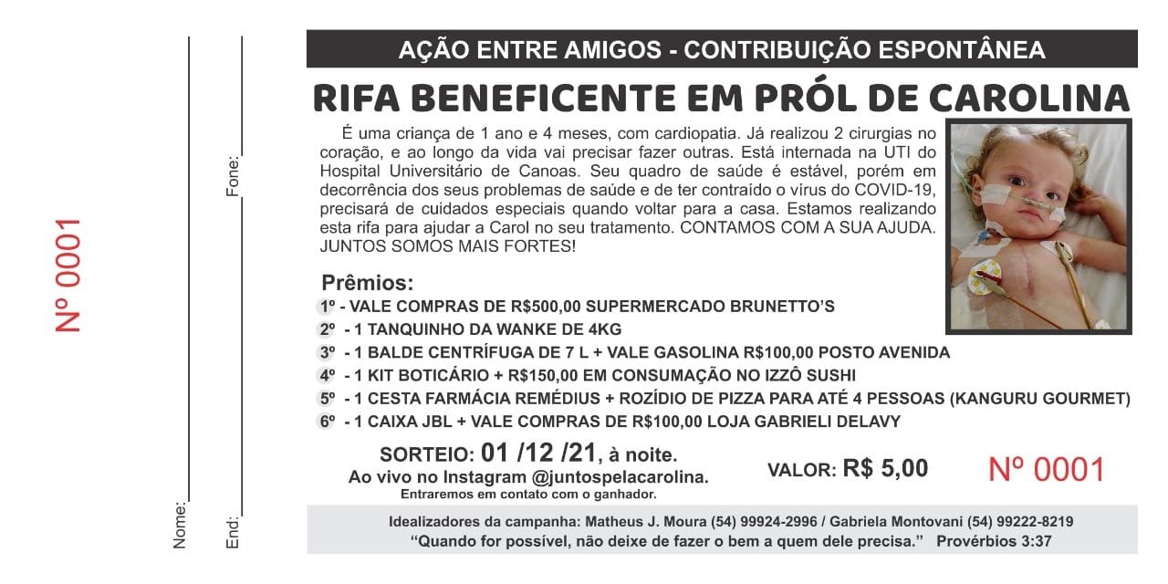 Os números da rifa estão sendo vendidos por R$ 5 cada, e podem ser adquiridos diretamente com os idealizadores da campanha Matheus J. Moura (54) 99924-2996 ou Gabriela Montovani (54) 99222-8219. O casal, juntamente com a delegada regional Fabiane Bittencourt, estão engajados no auxílio da Carol, mobilizando a comunidade.