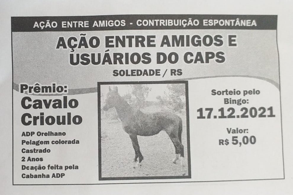 Uma ação entre amigos está sendo realizada em Soledade em benefício aos usuários do CAPS – Centro de Atenção Psicossocial. A rifa tem como prêmio um cavalo crioulo que foi doado pela Cabanha ADP.