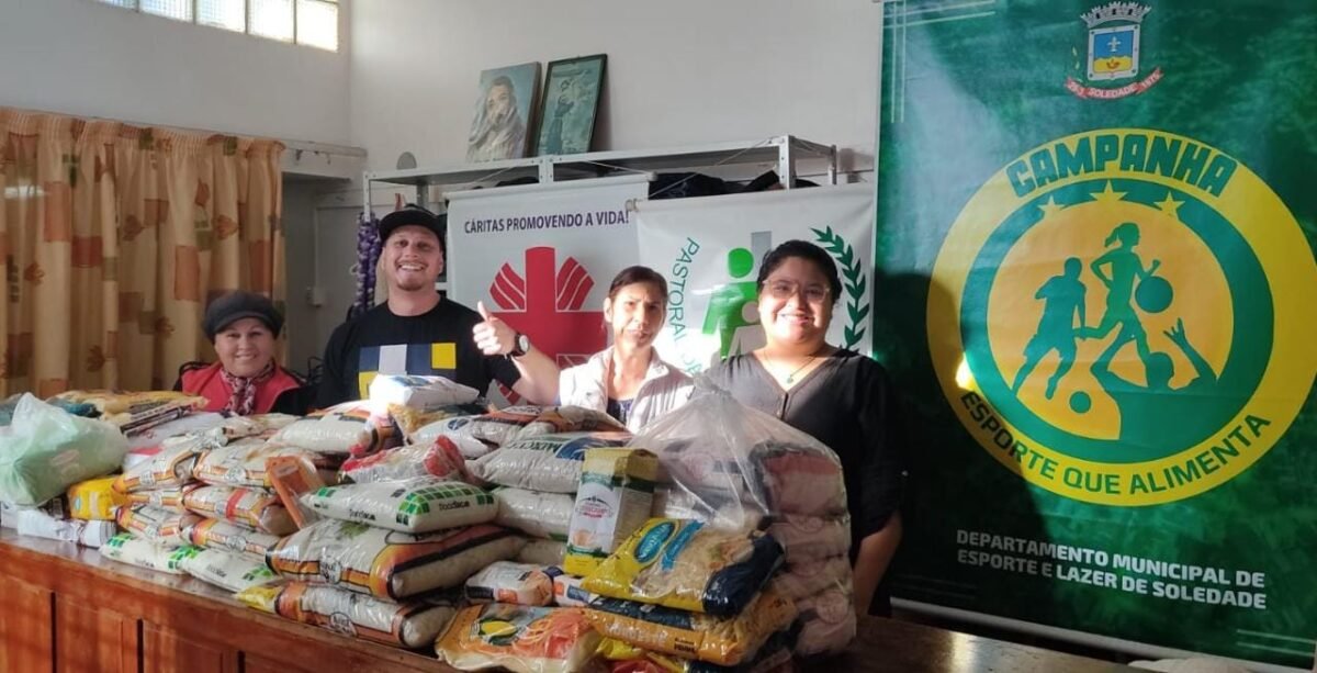 A Campanha “Esporte que Alimenta” promovida pelo Departamento de Esportes e Lazer do Município de Soledade arrecadou, nesta nova etapa do Projeto, cerca de uma tonelada de alimentos não perecíveis. A iniciativa tem como objetivo dar apoio a Secretaria da Assistência Social do município e demais organizações da sociedade civil de Soledade. Nesta fase do projeto, além da Secretaria da Assistência social, a Pastoral da Criança e a Cáritas também foram beneficiadas com os alimentos.