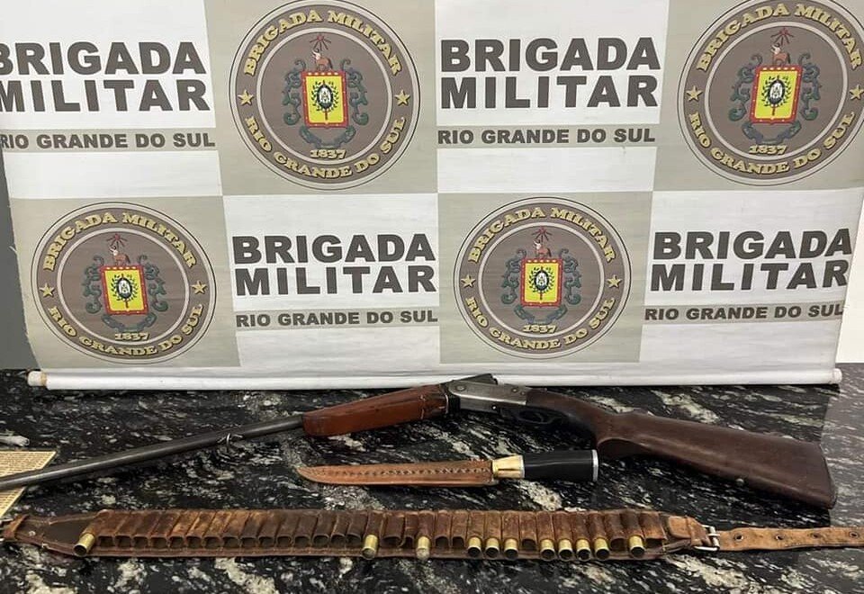 Os policiais foram até a residência e encontraram o criminoso sentado no sofá com munições, uma espingarda calibre 28 e uma faca na cintura.