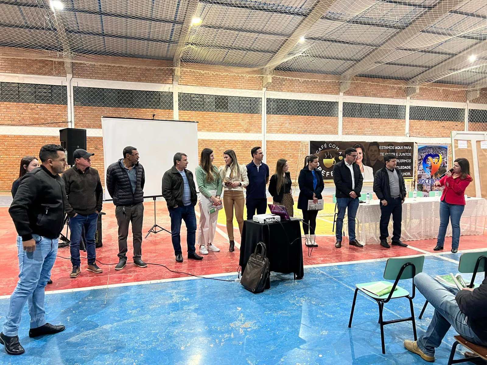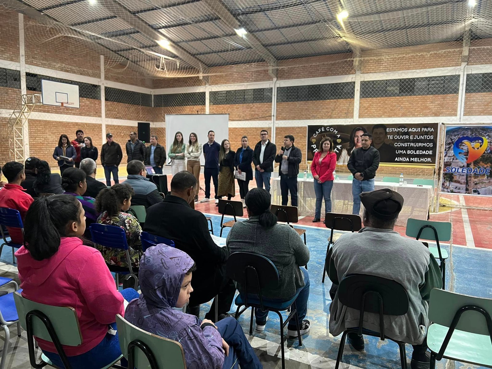 No início da noite desta quarta-feira, 01/07, todo o secretariado que integra o Poder Executivo de Soledade se reuniu no ginásio poliesportivo do bairro das Fontes para ouvir pontos e demandas dos moradores do bairro em mais uma edição do Café com a Prefeita.