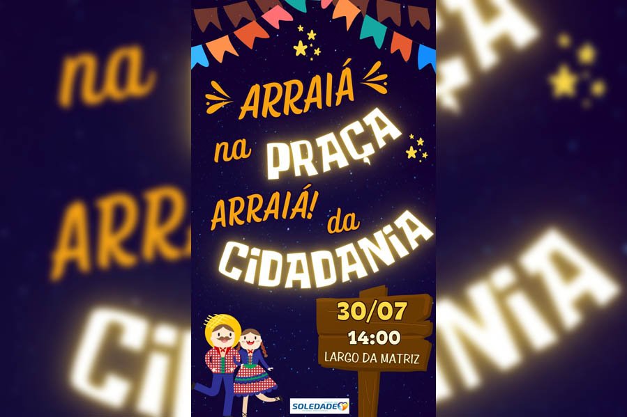 Toda comunidade está convidada a participar do “Arraiá na Praça: o Arraiá da Cidadania”, que vai acontecer no dia 30 de julho, domingo, na Praça Olmiro Ferreira Porto. O objetivo é proporcionar uma festa cultural, gastronômica e musical com acesso aos serviços do Sistema de Garantia de Direitos do município de Soledade.