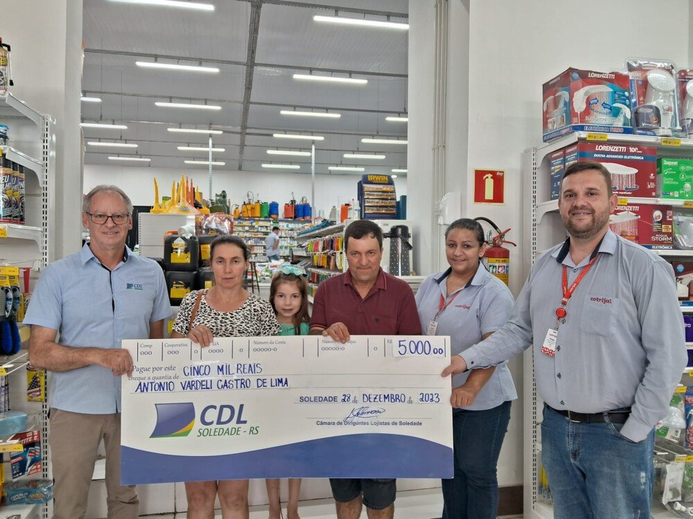 O presidente da CDL Soledade, Vanderlei Mallmann enfatiza a importância desta entrega. “Conseguimos entregar os prêmios do último sorteio da campanha neste ano e finalizamos nesta sexta-feira, 28/12, a entrega ao senhor Antônio Castro de Lima, morador do Pinhal. Agradecemos a todos os lojistas e clientes que participaram da promoção e para 2024, teremos nosso cinquentenário, assim a Soledade é Mais será uma edição especial, provavelmente com mais premiações por sorteio”.