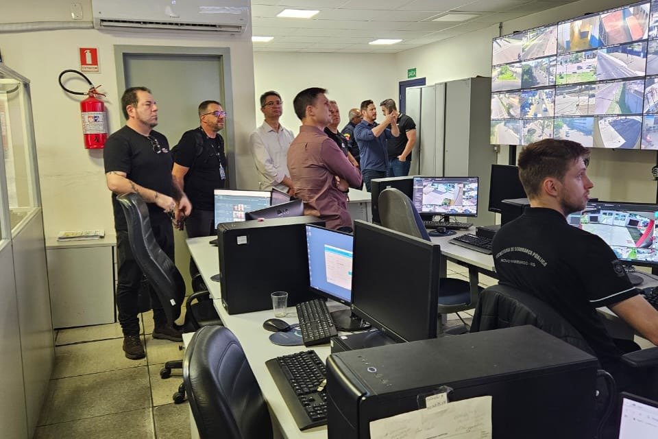 Durante a visita, o grupo conheceu o funcionamento do moderno sistema de videomonitoramento implantado em Novo Hamburgo, que conta com tecnologias capazes de captar placas de veículos a longas distâncias, realizar cercamento eletrônico e identificar veículos por placa, tipo, cor e velocidade. O sistema também utiliza inteligência artificial e reconhecimento facial, ampliando a eficiência das ações de segurança.