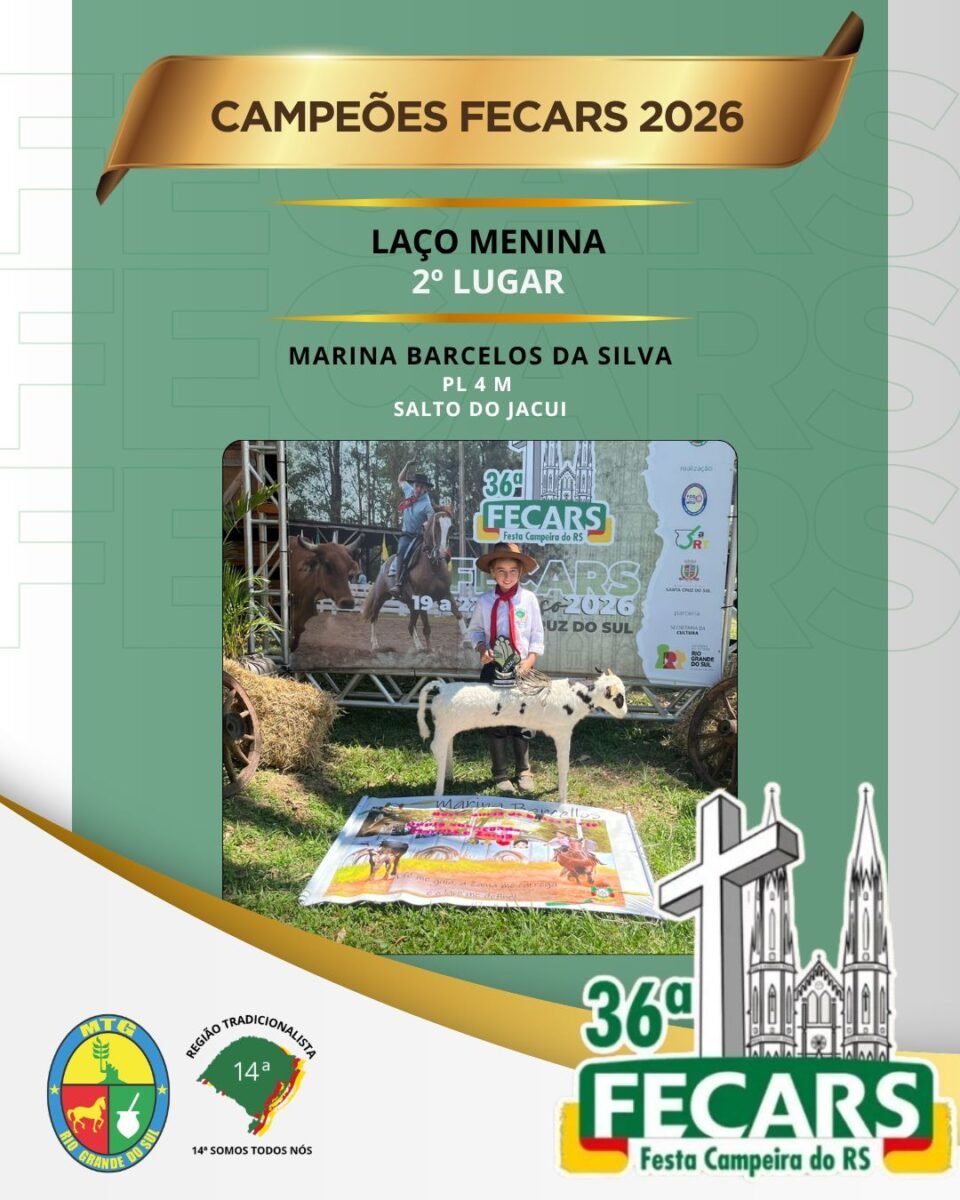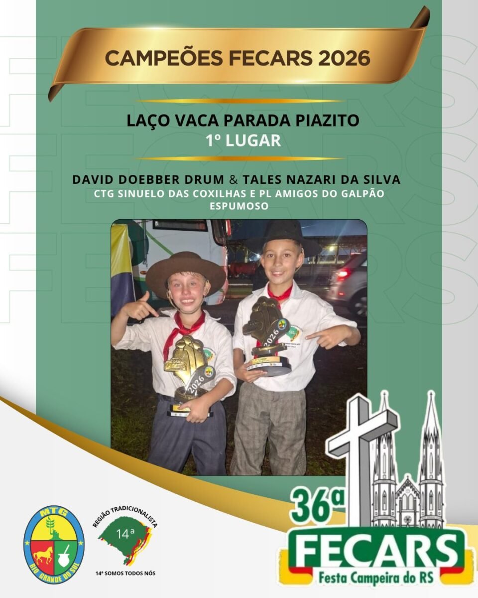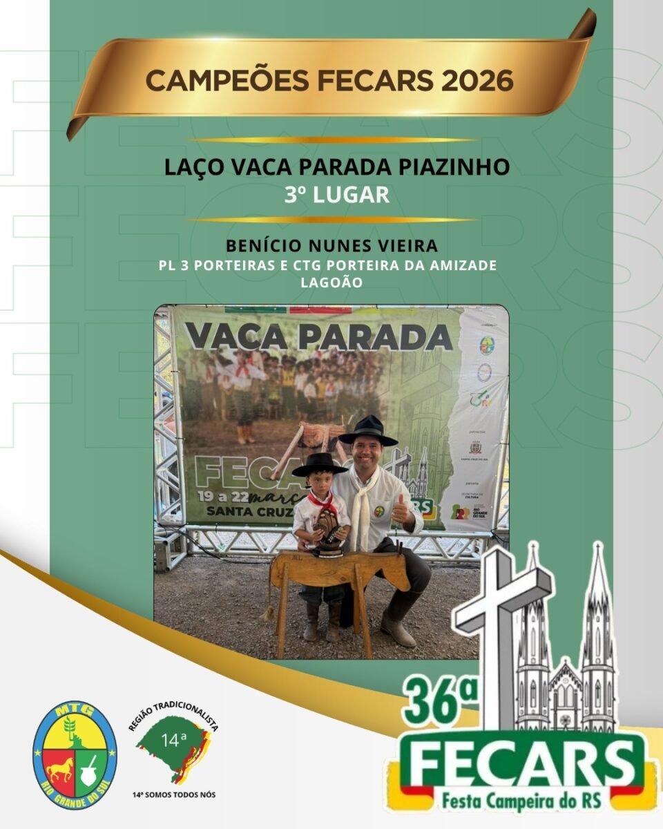 A 36ª Fecars (Festa Campeira do Rio Grande do Sul) foi realizada de 19 a 22/03 de 2026, no Parque Municipal de Eventos, em Santa Cruz do Sul, reunindo cerca de 10 mil pessoas e 1,9 mil competidores de 30 Regiões Tradicionalistas.