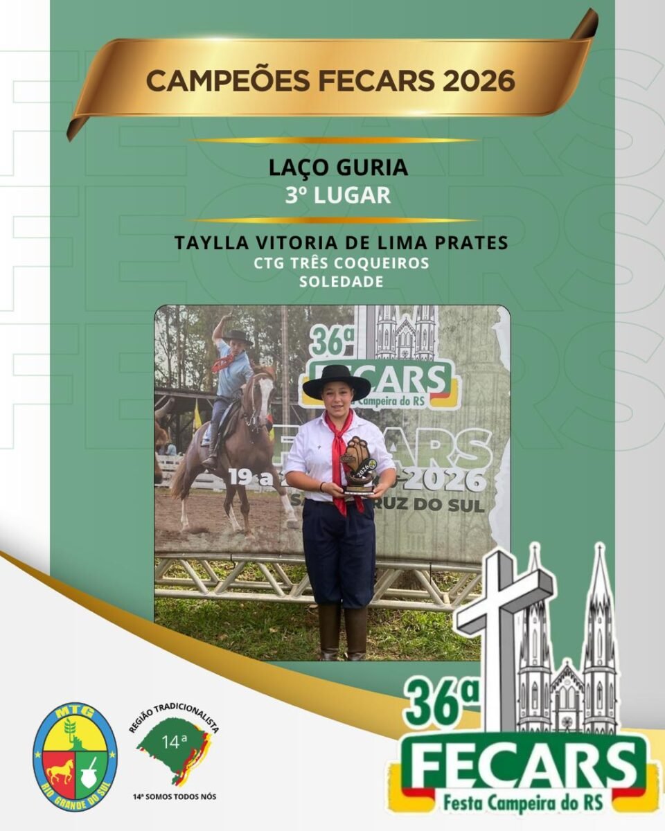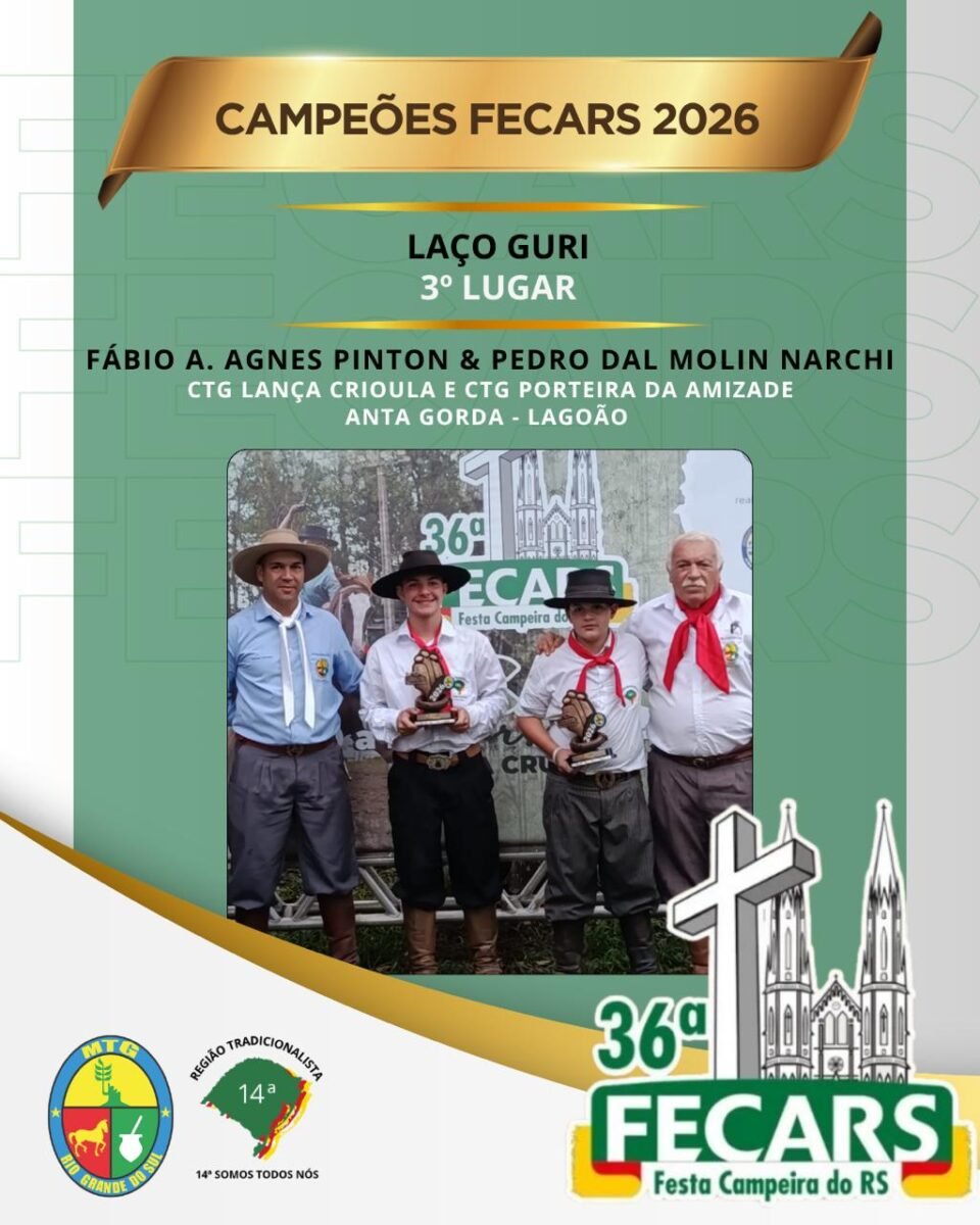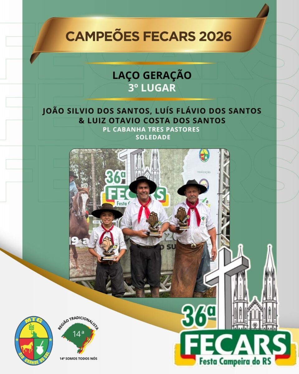 Entre os destaques da participação da 14ª Região Tradicionalista (RT), os soledadenses João Silvio dos Santos, Luís Flávio dos Santos e Luiz Otávio Costa dos Santos, pai, filho e neto respectivamente, conquistaram o 3º lugar na categoria Laço Geração.