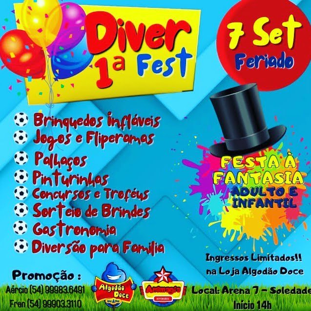 A Animagia Diversões e a Loja Algodão Doce estão organizando uma grande festa a fantasia e de diversão para toda a família em Soledade. A 1ª Diver Fest acontece na próxima quarta-feira, feriado do dia 07/09, a partir das 14h na Arena 7. Os ingressos, tanto adulto como infantil, são limitados e podem ser adquiridos no valor de R$ 15 na Loja Algodão Doce.