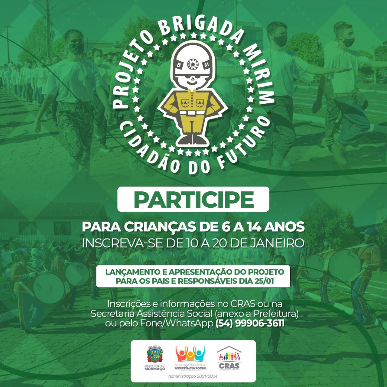 Além disso, o projeto social Brigada Mirim está sendo reativado neste ano, em um formato um pouco diferente em relação a última vez. As inscrições estão abertas até o dia 20 de janeiro e podem participar crianças de 6 a 14 anos. O lançamento e apresentação para os pais e responsáveis acontece no dia 25/01.