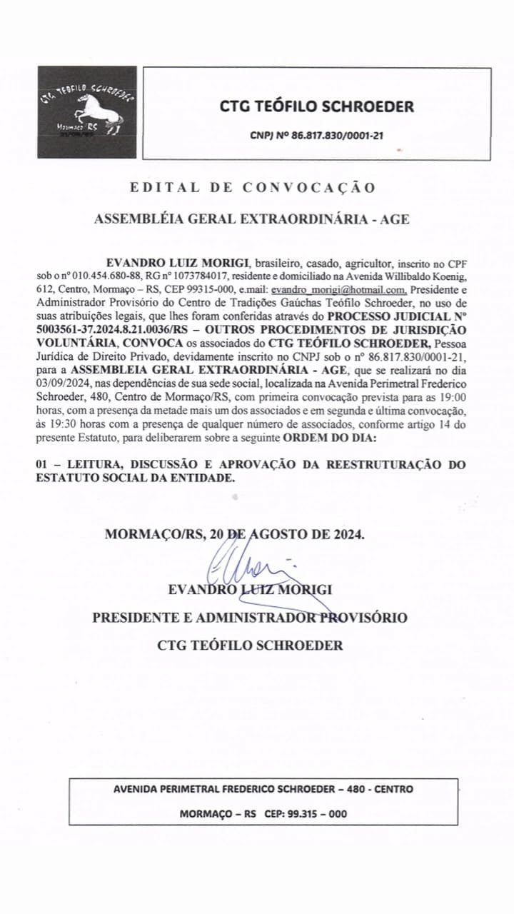 O CTG Teófilo Schroeder, localizado em Mormaço/RS, realizará uma Assembleia Geral Extraordinária (AGE) no dia 3 de setembro de 2024, conforme convocação feita pelo presidente da entidade, Evandro Luiz Morigi.