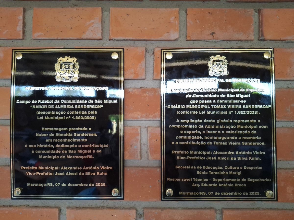 Foi realizada na manhã deste domingo, 07/12, a cerimônia de inauguração da ampliação do Ginásio Poliesportivo da comunidade de São Miguel, em Mormaço, juntamente com a entrega oficial das homenagens que passam a denominar o espaço como Ginásio Poliesportivo “Tomás Vieira Sanderson” e o Campo de Futebol “Nabor Almeida Sanderson”, conforme estabelece a Lei Municipal nº 1.622/2025.