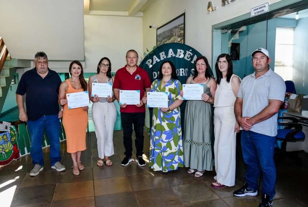 Foram empossados para o biênio 2026/2027 os seguintes diretores: Adilane Kuhn, na EMEI Sonho de Criança; Helena de Oliveira Broch, na EMEI Antônio Marquetti; Jocélia de Fátima Vicari Fabris, na EMEF José Rodrigues Cardoso; Rui Ceccon, na EMEF Antônio de Godoy Bueno; e Silvia Almerinda Borges Gehlen, na EMEF Achilles Porto Alegre Filho.