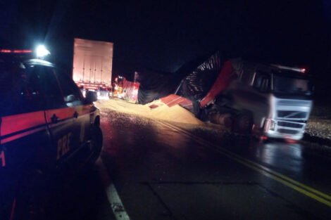 Colisão frontal envolveu carreta carregada de soja e veículo de passeio; ninguém ficou ferido.