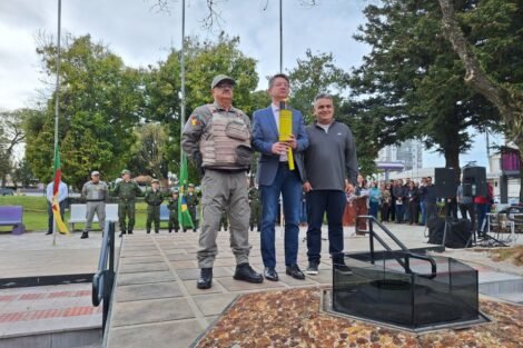 Atividades reuniram alunos, professores e comunidade em frente à Prefeitura Municipal, com participação do CTG Lenço da Amizade e CTG Teófilo Schroeder.