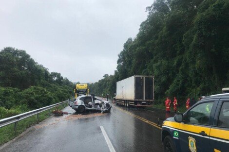 A condutora foi identificada como Cleonice Elizabete Cemin, 51 anos. Colisão frontal entre carro e caminhão aconteceu no km 309 da rodovia na manhã deste sábado, 18/11.