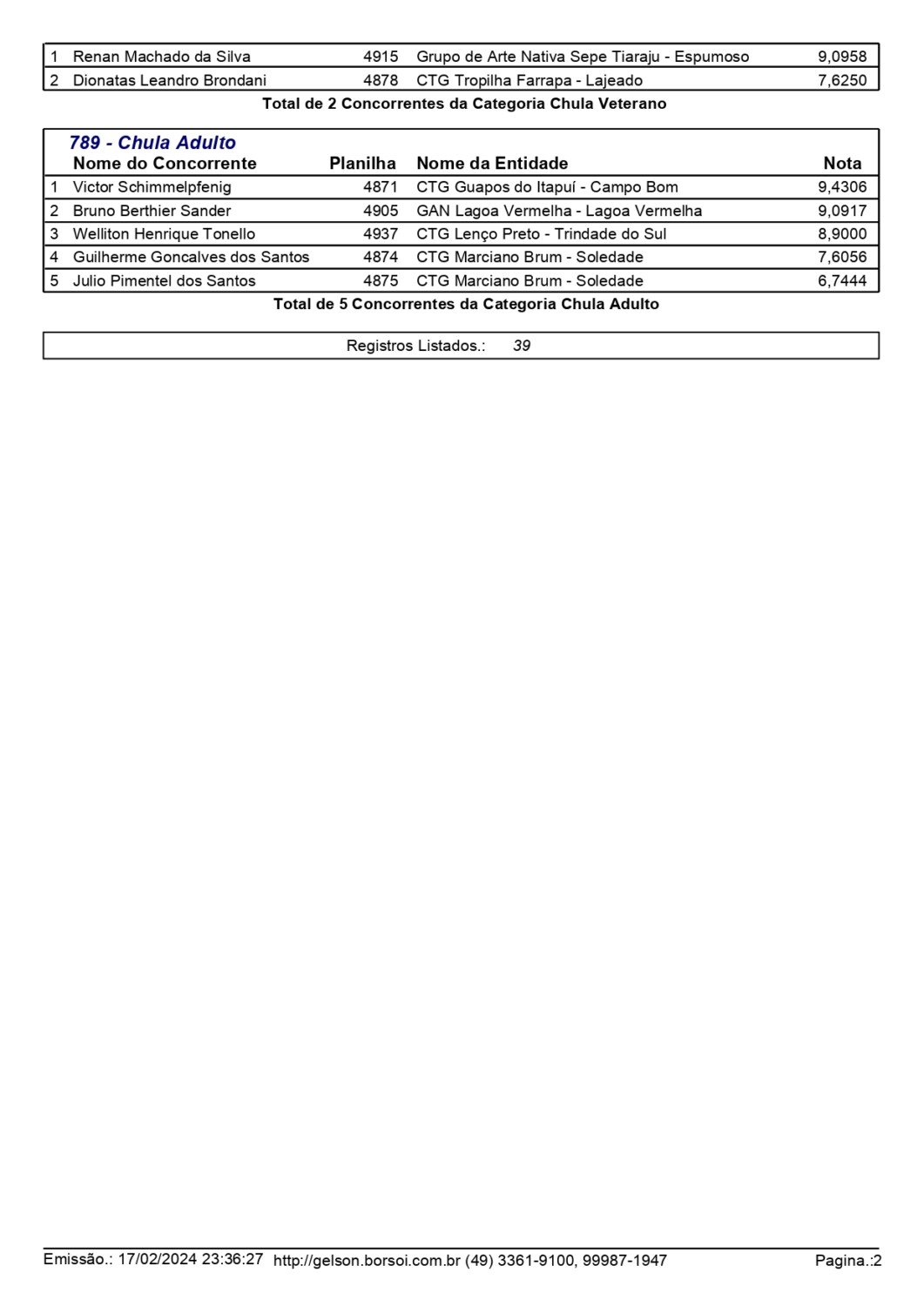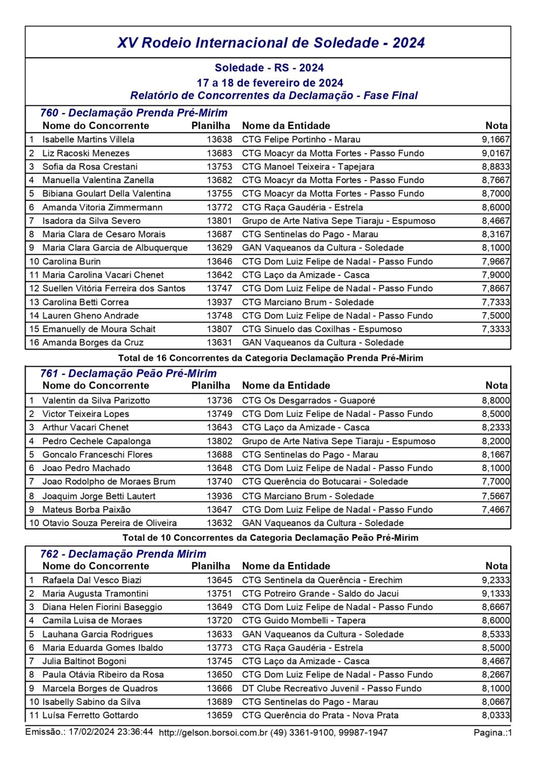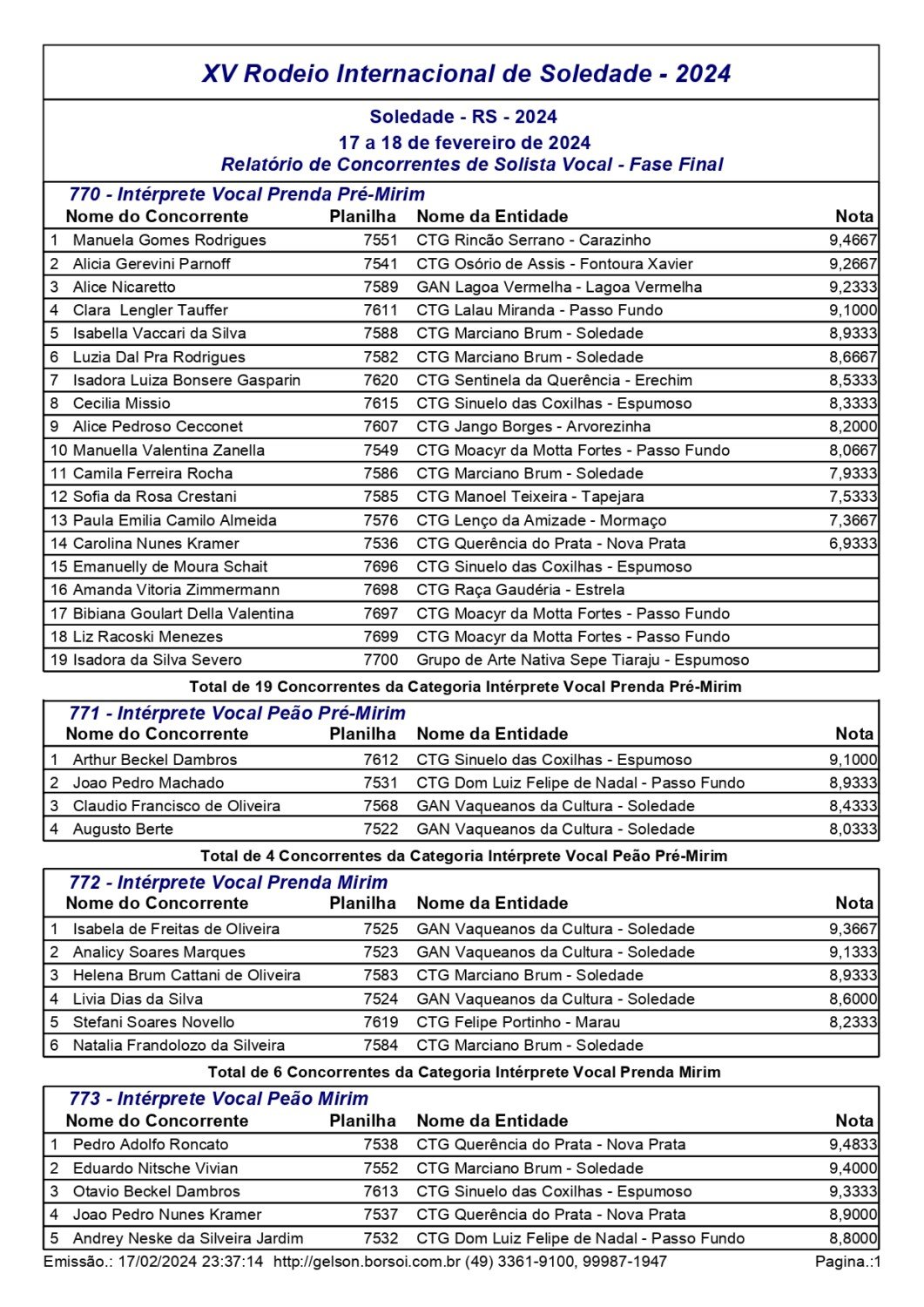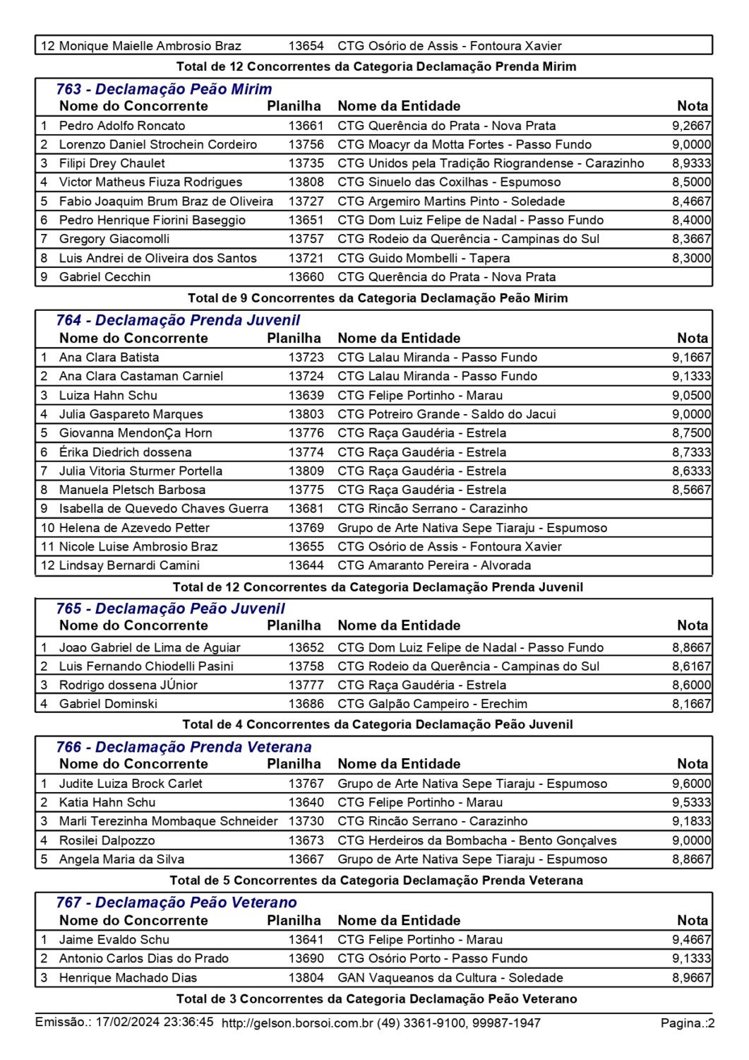 Nas danças tradicionais pré-mirim e mirim, o CTG Moacyr da Motta Fortes, de Passo Fundo, saiu como grande campeão, conquistando o primeiro lugar em ambas as categorias. No total participaram 20 invernadas. Já nas modalidades individuais, mais de 200 competidores participaram das provas de chula, declamação, gaita, intérprete vocal e trova.