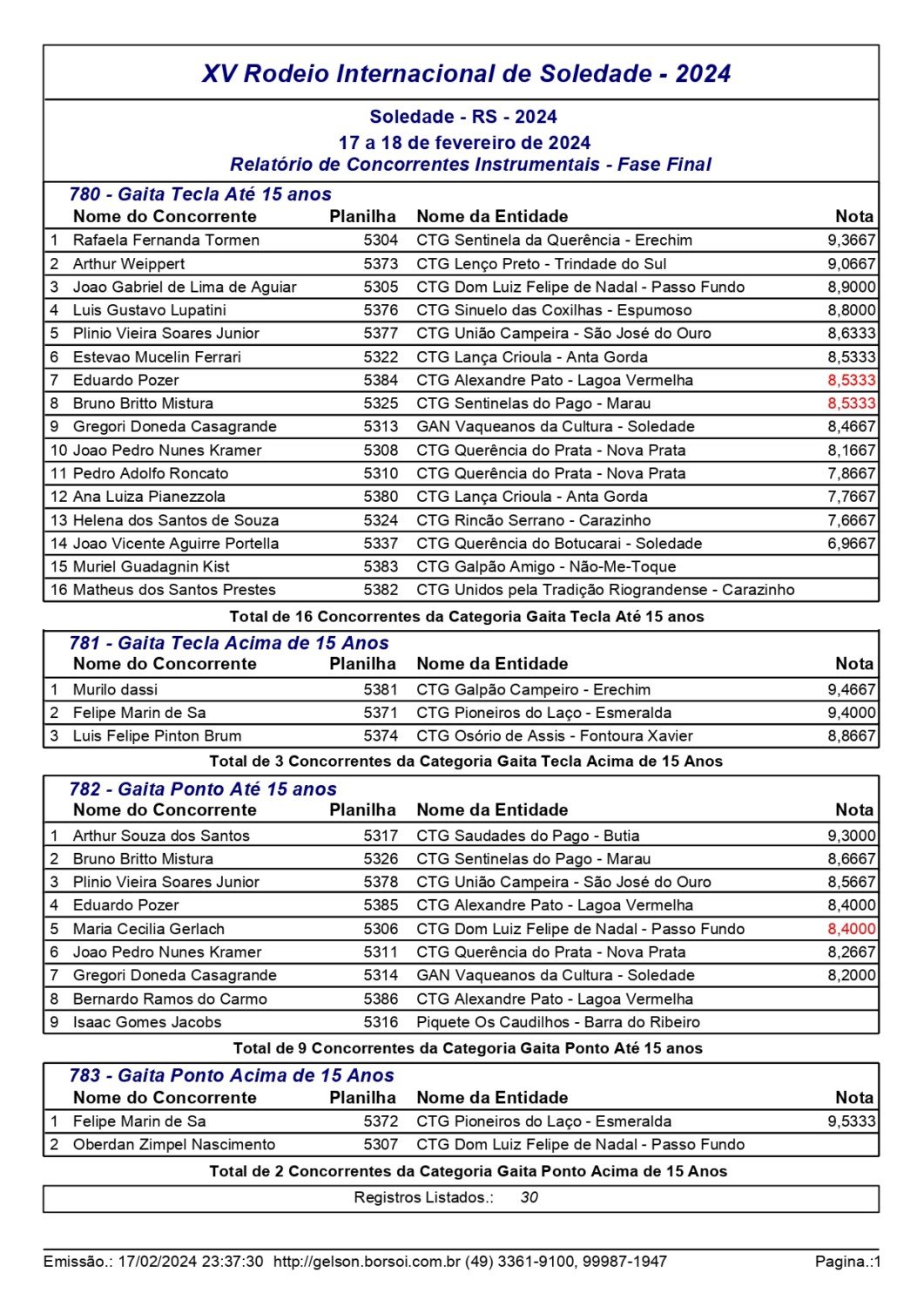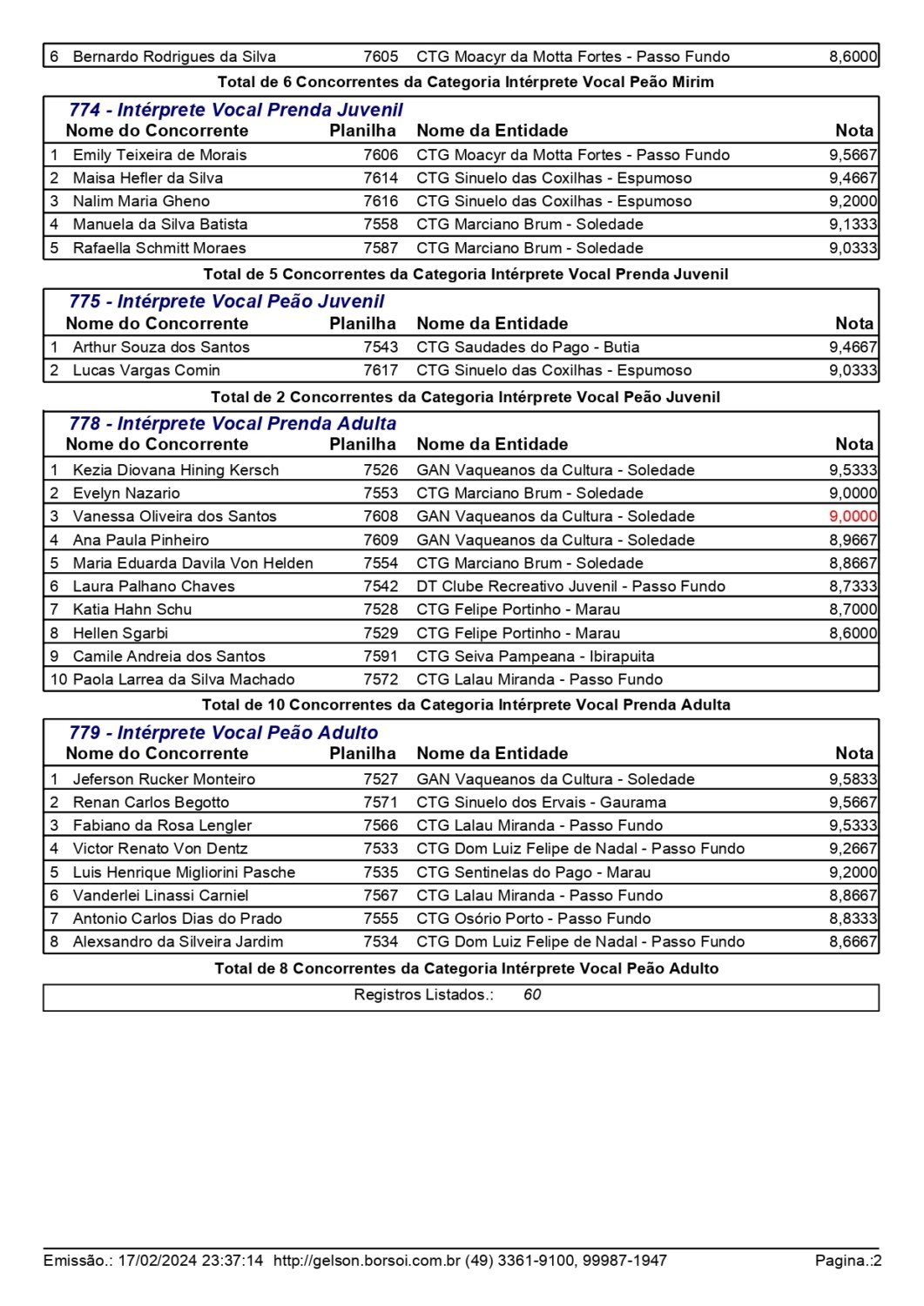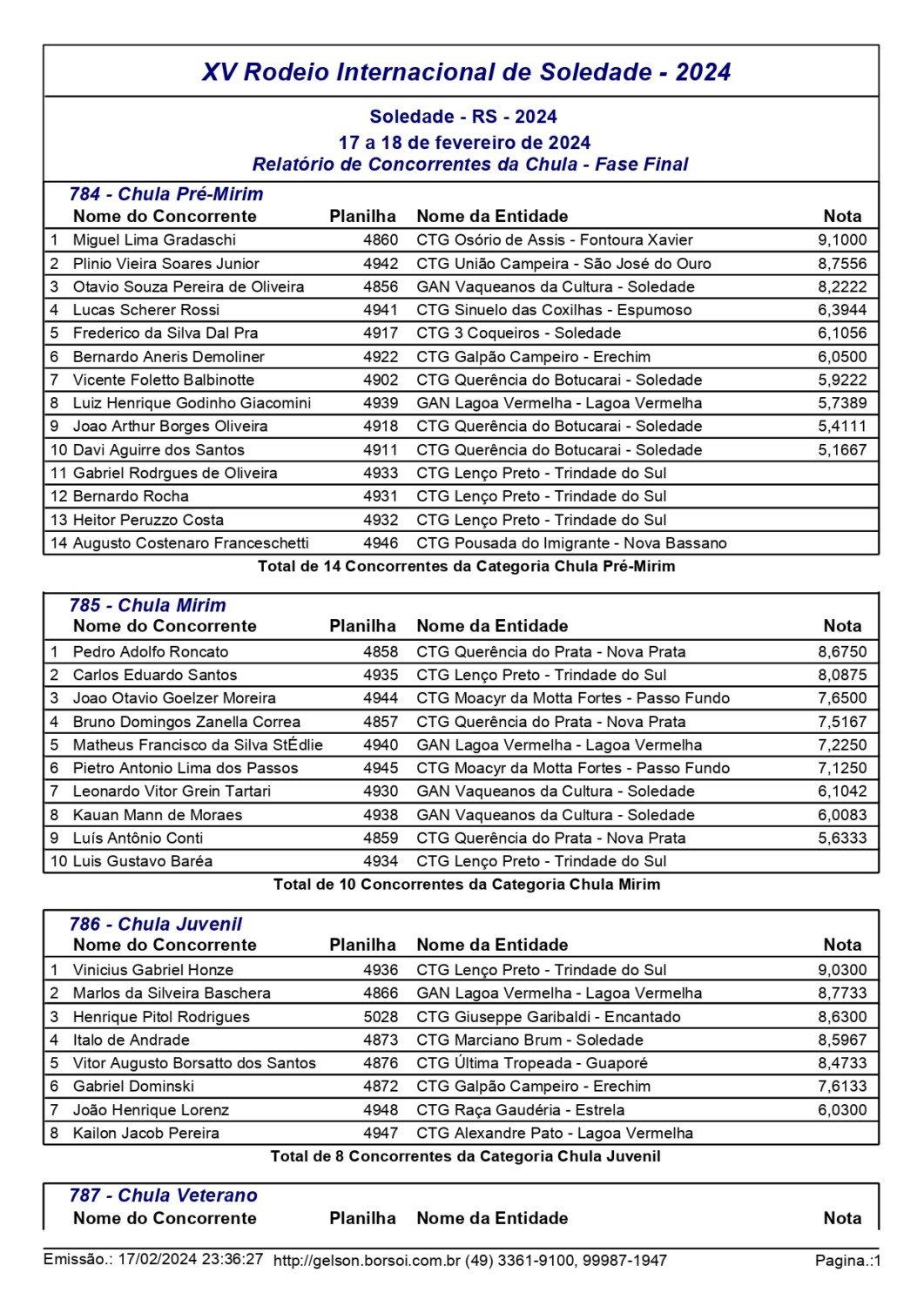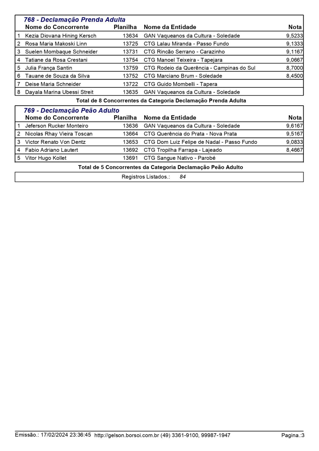 Nas danças tradicionais pré-mirim e mirim, o CTG Moacyr da Motta Fortes, de Passo Fundo, saiu como grande campeão, conquistando o primeiro lugar em ambas as categorias. No total participaram 20 invernadas. Já nas modalidades individuais, mais de 200 competidores participaram das provas de chula, declamação, gaita, intérprete vocal e trova.