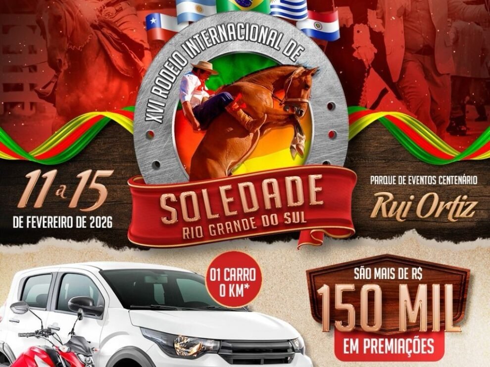 A comissão organizadora do XVI Rodeio Internacional de Soledade trabalha intensamente na preparação do evento, que acontecerá de 11 a 15 de fevereiro de 2026, no Parque de Eventos Centenário Rui Ortiz. O evento é uma promoção da Aprosol – Associação Pró-Desenvolvimento do Município de Soledade e a co-realização da Prefeitura Municipal.