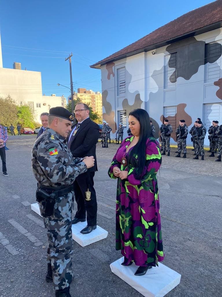 A honraria, que é concedida à autoridades que auxiliam a enaltecer a imagem da Brigada Militar no Estado e foi entregue a sete autoridades civis e a dez militares.
