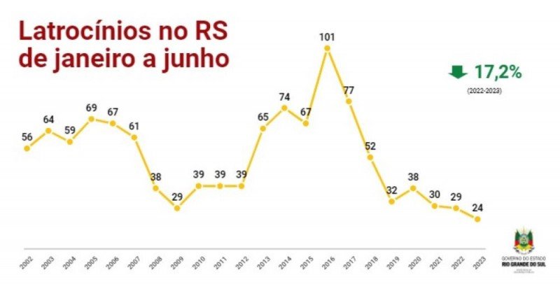 No caso dos latrocínios, o semestre fechou em queda de 17%, ante igual período de 2022. Ao todo, foram computadas 24 ocorrências de janeiro a junho desde ano. No mês passado, foram dois casos a mais em comparação com junho de 2022. Em função desta oscilação, a Secretaria da Segurança Pública reitera que ações efetivas vão seguir sendo adotadas a curto, médio e longo prazo para reduzir ainda mais as mortes violentas no RS. Além disso, a PC segue canalizando esforços para elucidar todos os inquéritos.