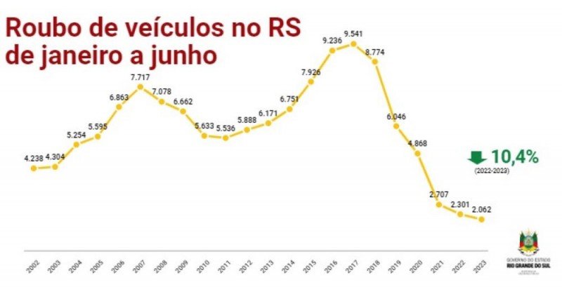 Os índices do RS também foram refletidos na Capital, com recuo de 13%. Recortando apenas o último mês de junho, no Rio Grande do Sul a queda de roubos de veículos chegou a 14%. Em Porto Alegre, a diminuição foi de 2% nos últimos 30 dias.