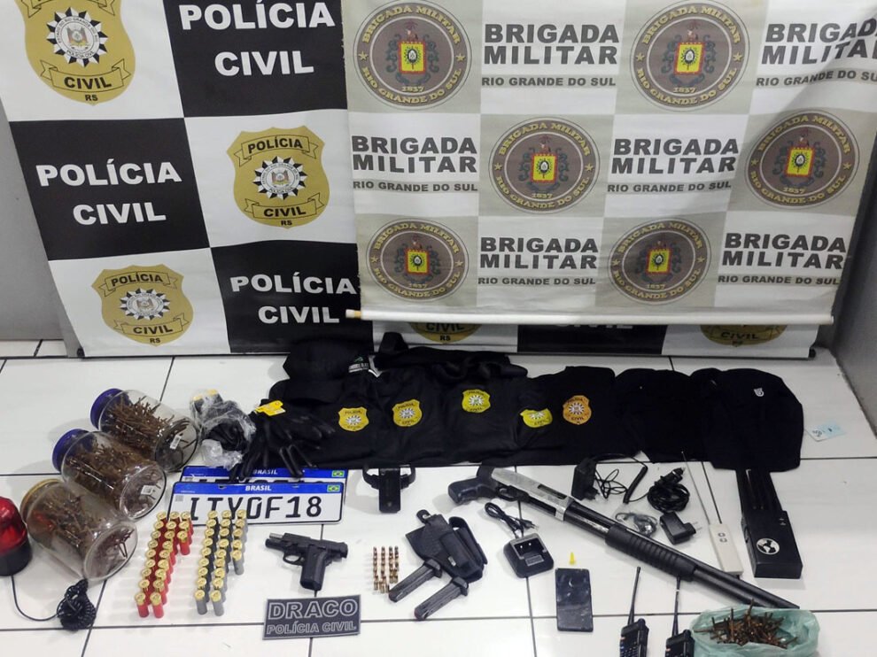 Durante a revista ao veículo, foram encontrados uma espingarda calibre 12, uma pistola calibre .380, munições de ambos os calibres, rádios comunicadores na frequência da Brigada Militar, bloqueadores de sinal, roupas da Polícia Civil do RS, toucas ninja, luvas e grande quantidade de miguelitos.