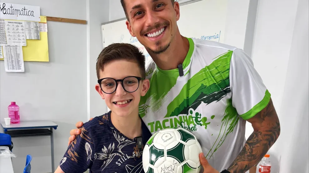Após três meses cuidando de um autógrafo no braço, Benício reencontra o ídolo, ganha presentes e compartilha emoção com os colegas