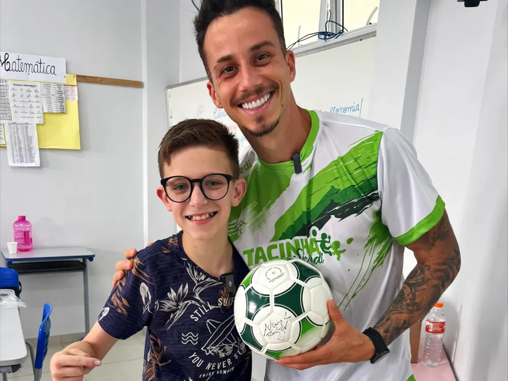 A emoção tomou conta do ambiente. Além de renovar a assinatura, Adonias presenteou Benício com uma bola e uma camisa autografadas, reforçando o vínculo com o esporte e a importância de acreditar nos sonhos. O atleta também distribuiu autógrafos para outras crianças e interagiu com a turma, tornando o dia especial para todos.