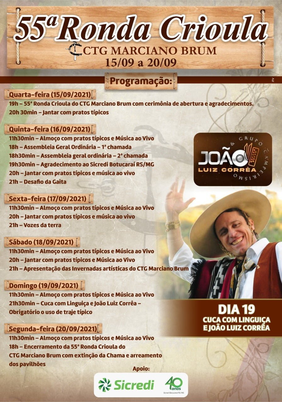 Seguindo as atividades planejadas, no dia 17/09 às 21h tem o “Vozes da Terra”. Dia 18/09 às 21h apresentação das invernadas artísticas e no dia 19/09, a partir das 21h30min a Cuca com Linguiça e João Luiz Corrêa, com traje típico obrigatório.