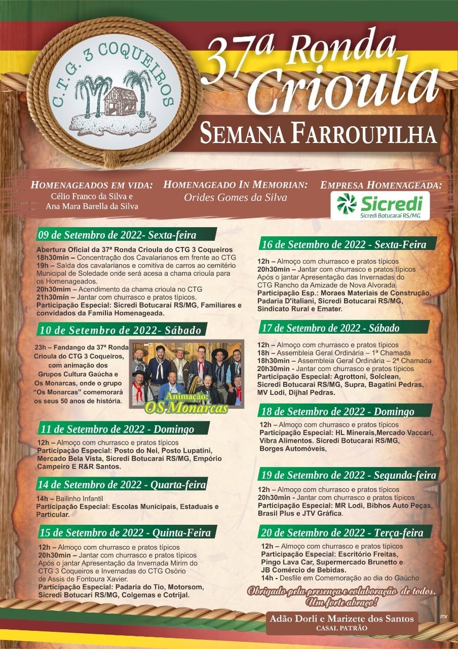 As atividades do CTG 3 Coqueiros seguem até o dia 20/09 com uma extensa programação, com destaque para os almoços e jantas com churrasco e pratos típicos, bem como o Fandango da 37ª Ronda Crioula, que acontece neste sábado, 10/09, e terá animação dos grupos “Cultura Gaúcha” e “Os Monarcas”. A venda de ingressos está sendo realizada diretamente na secretaria da entidade.