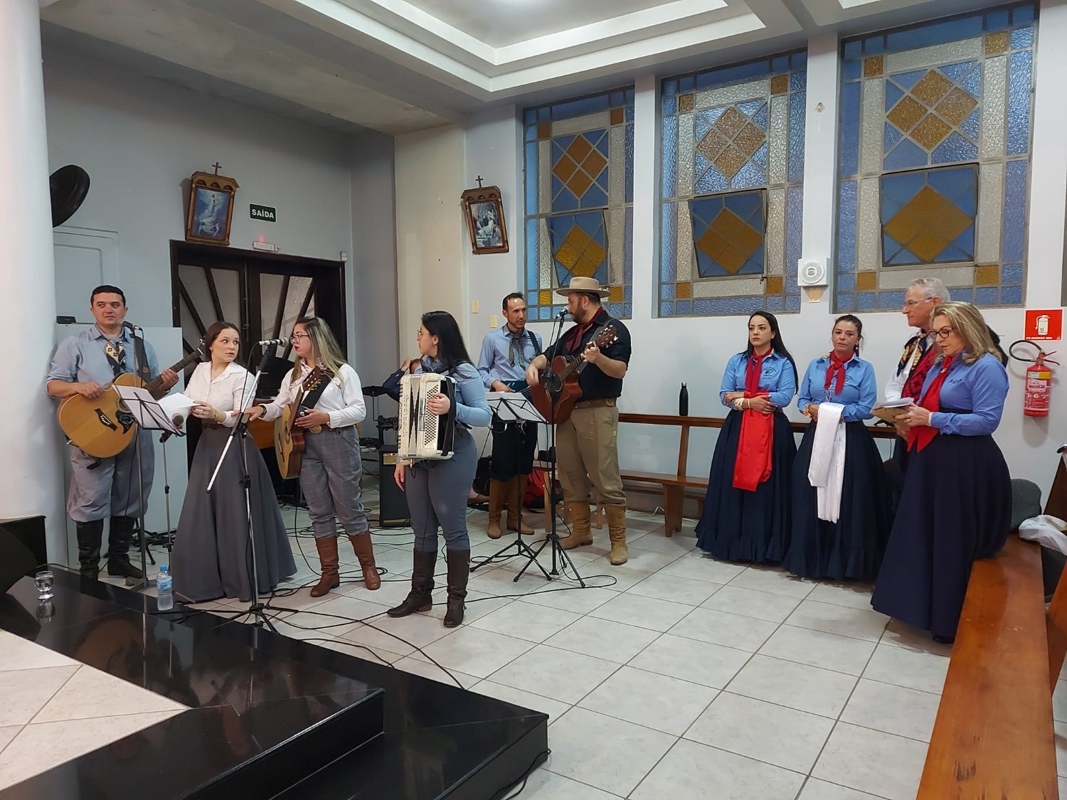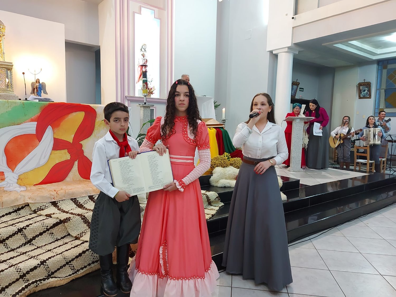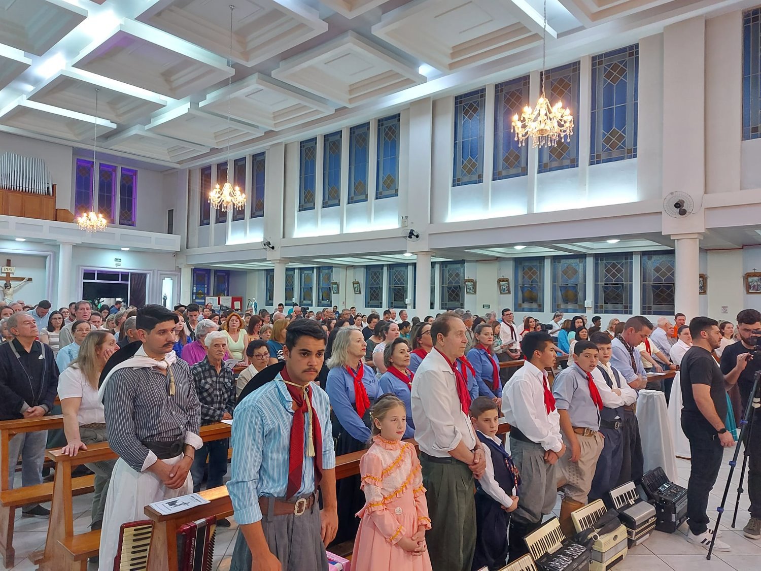 Na cerimônia, tradicionalistas levaram ao altar símbolos que representam a cultura gaúcha, como a Chama Crioula, as bandeiras, a imagem de São Pedro, a Cruz, a Bíblia, lenços nas cores vermelho, branco e preto, além da gaita, o pão e o vinho.