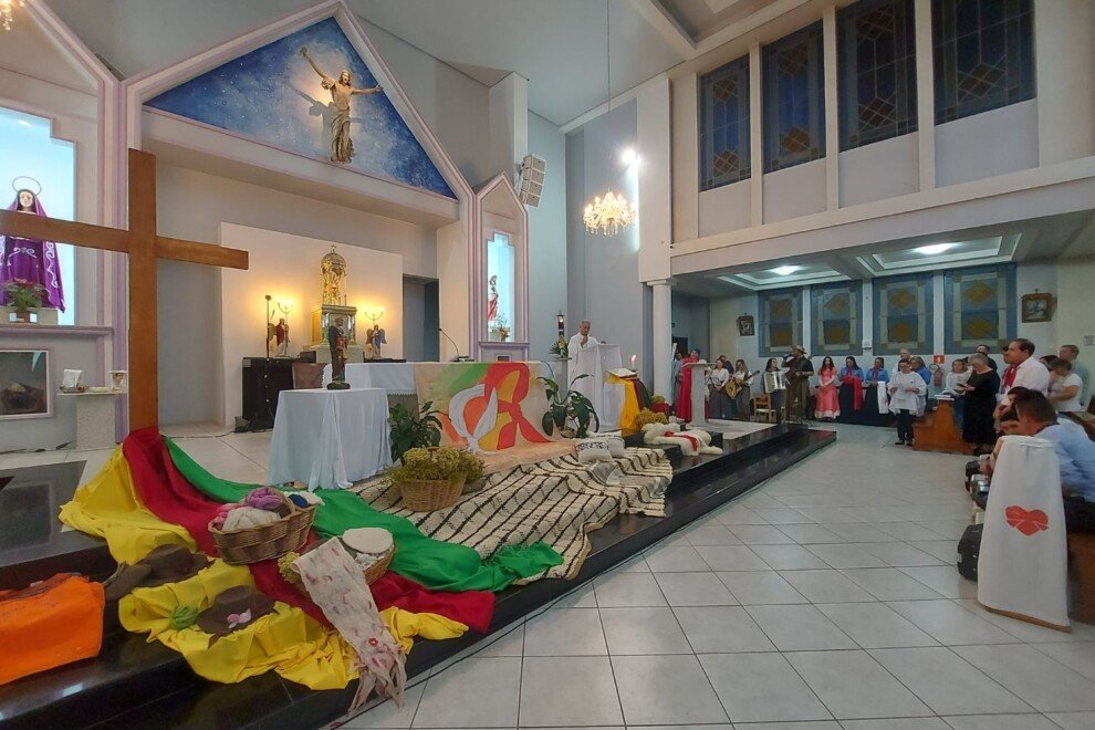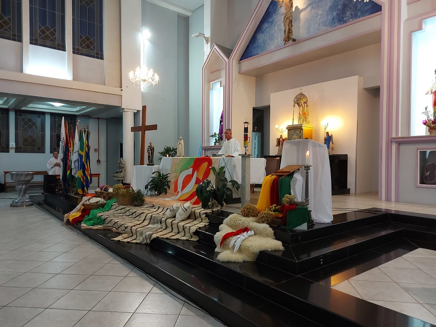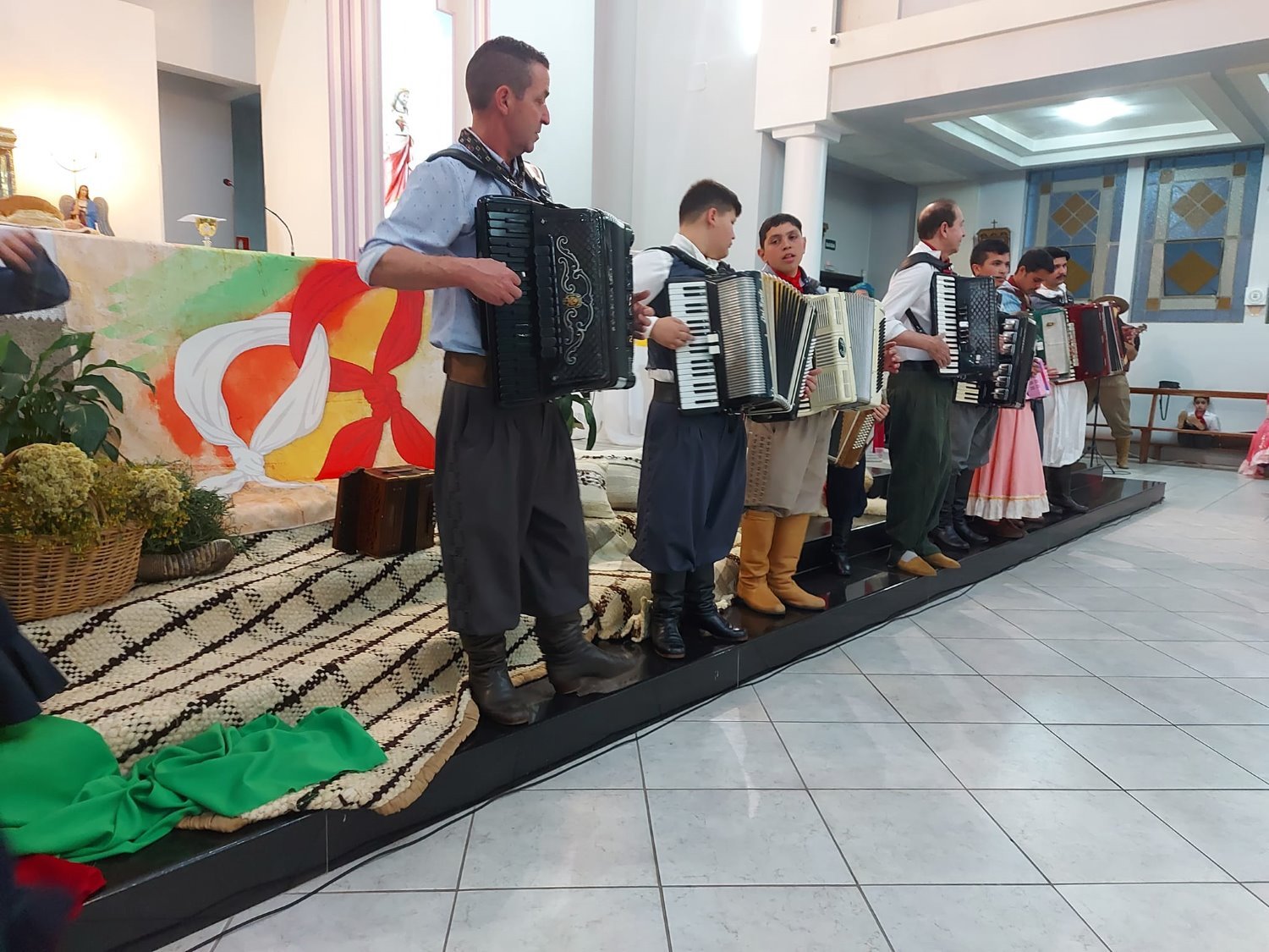 Na cerimônia, tradicionalistas levaram ao altar símbolos que representam a cultura gaúcha, como a Chama Crioula, as bandeiras, a imagem de São Pedro, a Cruz, a Bíblia, lenços nas cores vermelho, branco e preto, além da gaita, o pão e o vinho.